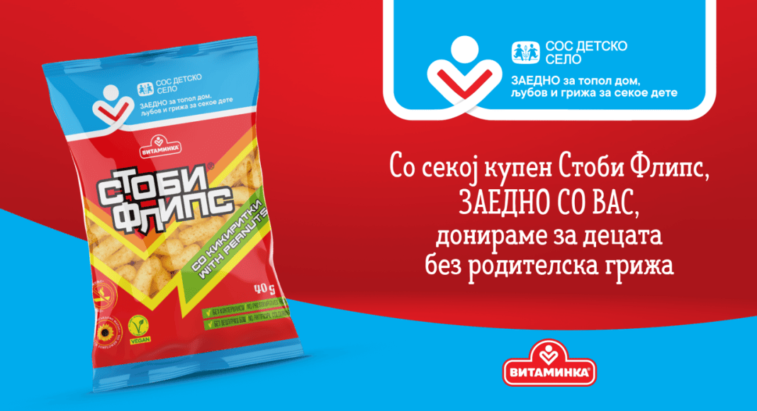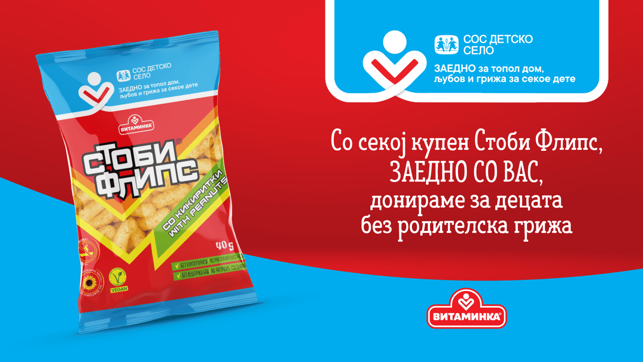 Со секој купен Стоби Флипс ќе се издвојуваат средства за децата поддржани од СОС Детско село Македонија. Со помош на оваа општествено одговорна кампања на Витаминка реализирана под слоганот „Заедно за топол дом, љубов и грижа за секое дете“ потрошувачите ќе можат директно да учествуваат во донаторскиот процес и да придонесат за посреќно детство на децата поддржани од СОС Детско село.