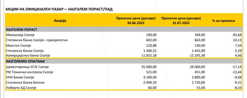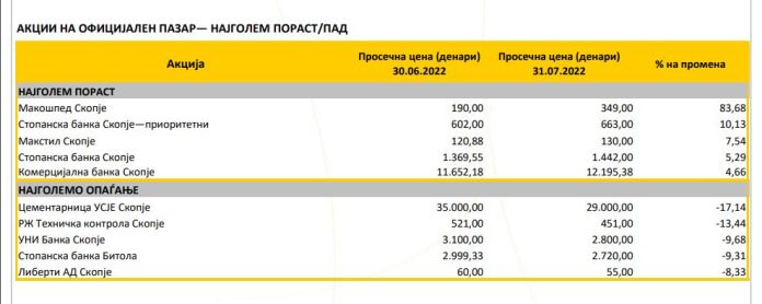 Во топ пет акции со најголем пораст, се повторно акциите на Стопанска банка Скопје но тоа место припадна за обичните акции, каде зголемувањето изнесува 5,29 проценти, или, на 30.06.2022 година една обична акција на „Стопанска банка Скопје“ се продавала за 1.369,55 денари, на крајот на 31.07.2022 година нејзината цена достигнала 1.442,00 денари за акција.