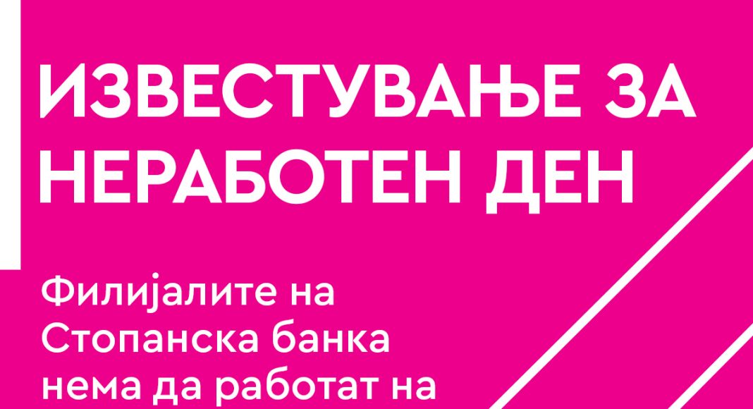 Ве известуваме дека по повод државниот празник – Ден на народното востание, филијалите на Стопанска банка АД – Скопје нема да работат на 11.10.2022 (вторник).