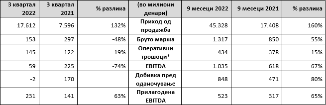 Во третиот квартал од 2022 година приходите од продажба достигнаа 17.612 милиони денари, што претставува зголемување за 132%, споредено со третиот квартал во 2021 година, предводени главно од дизелот, благодарение на тековното закрепнување на економскиот раст и значителниот транзитен туризам, што го поддржа закрепнувањето на побарувачката на домашниот и извозниот пазар.