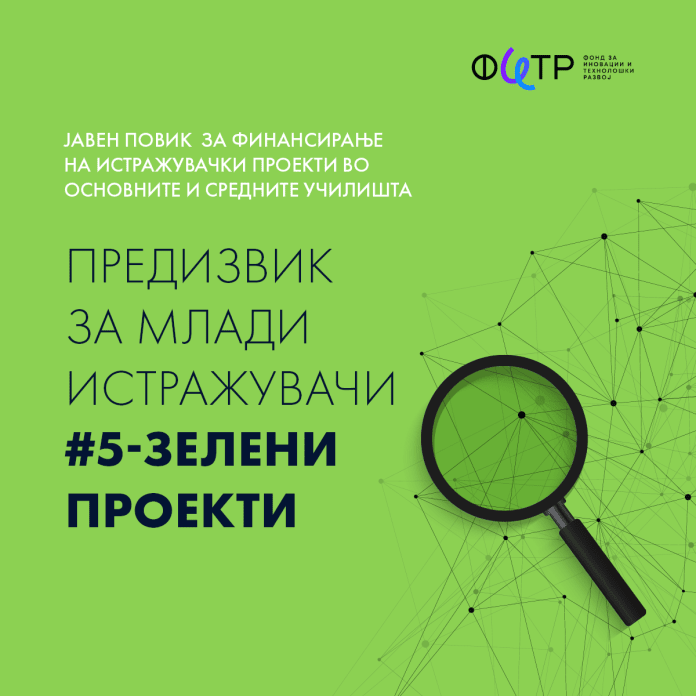 Фондот за иновации и технолошки развој денеска објави нов јавен повик „Предизвик за млади истражувачи 5 – Зелени проекти” наменет за ученици од целата држава, чија цел е поттикнување на креативното размислување кај младите и поддршка за истражувачки проекти базирани на научен метод.