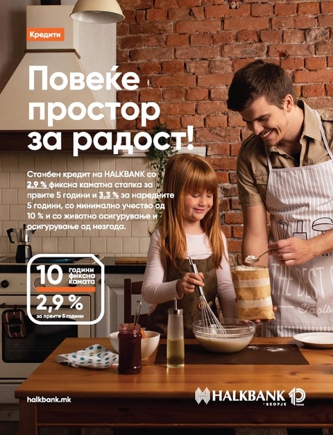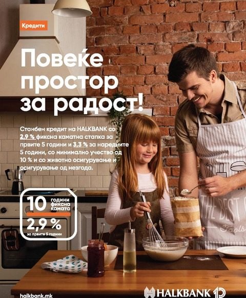 Халкбанк АД Скопје на своите коминтенти им нуди можност да земат кредит во висина до 300.000 евра, со фиксна каматна стапка за првите 10 години која, за првите 5 години изнесува 2,9%, а за следните 5 години – 3,3%. За останатиот период на отплата, кој може да биде до 30 години, каматната стапка изнесува 4 фиксни процентни поени + променлива стапка на 6 месечен Еурибор. Овој производ е со ниска стапка на вкупни трошоци (СВТ) која за кредит во висина од 50.000 евра и рок на отплата од 30 години со понудените каматни стапки изнесува 3,54%. Кредитобарателот дополнително добива можност и за грејс период во отплатата до 12 месеци.