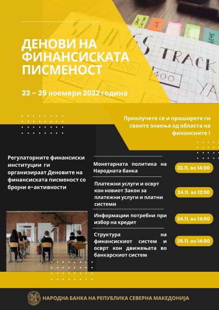 Деновите на финансиската писменост, коишто се организираат по шести пат, годинава ќе се одржат од 23 до 25 ноември, со обезбедување на предавања на повеќе теми за секој заинтересиран граѓанин.