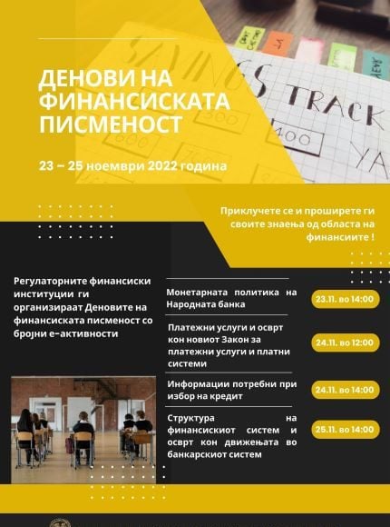 Деновите на финансиската писменост, коишто се организираат по шести пат, годинава ќе се одржат од 23 до 25 ноември, со обезбедување на предавања на повеќе теми за секој заинтересиран граѓанин.