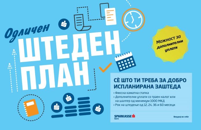 Од 1 јули 2022 година, Шпаркасе Банка АД Скопје ја збогати својата депозитна понуда со нов депозит за физички лица – Штеден план, погоден за клиентите кои се заинтересирани да штедат во денари и кои сакаат да направат добар план за заштеда на подолг период.