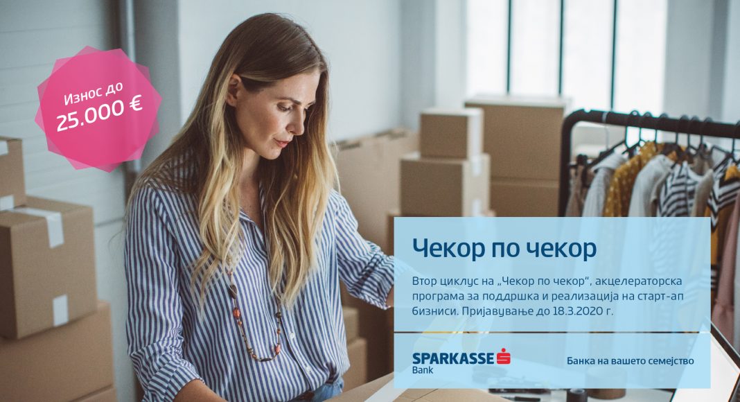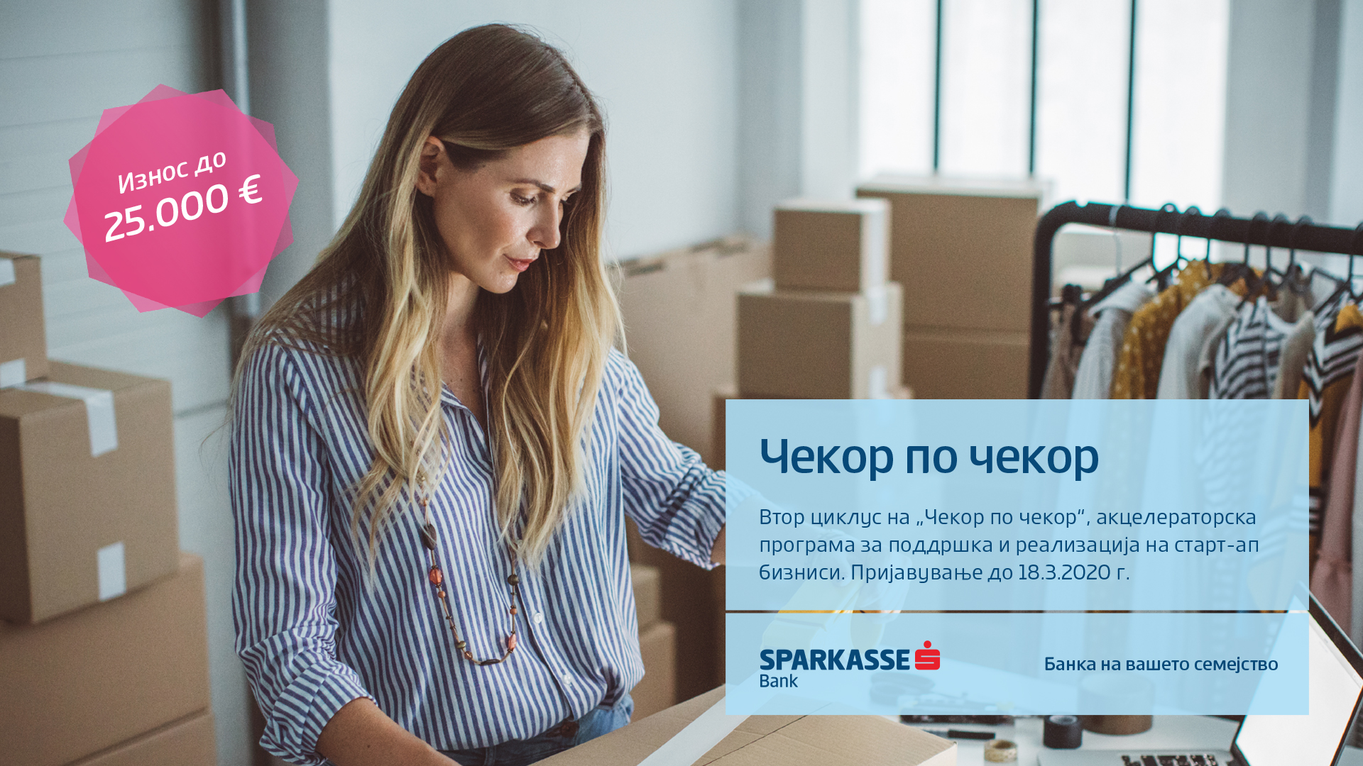 Шпаркасе Банка Македонија втора година по ред ќе го поддржи развојот на младите амбициозни претприемачи со идеја за создавање сопствен бизнис, кои имаат потреба од финансиска помош за понатамошен развој. „Чекор по чекор“ е првата акцелераторска програма од овој вид, која има за цел да обезбеди парична и општествена поддршка на компаниите што се во почетната фаза на отпочнување сопствен бизнис, со можност за кредитирање во износ до 25.000 евра и понуда на пакети за образовна, финансиска и менторска поддршка.