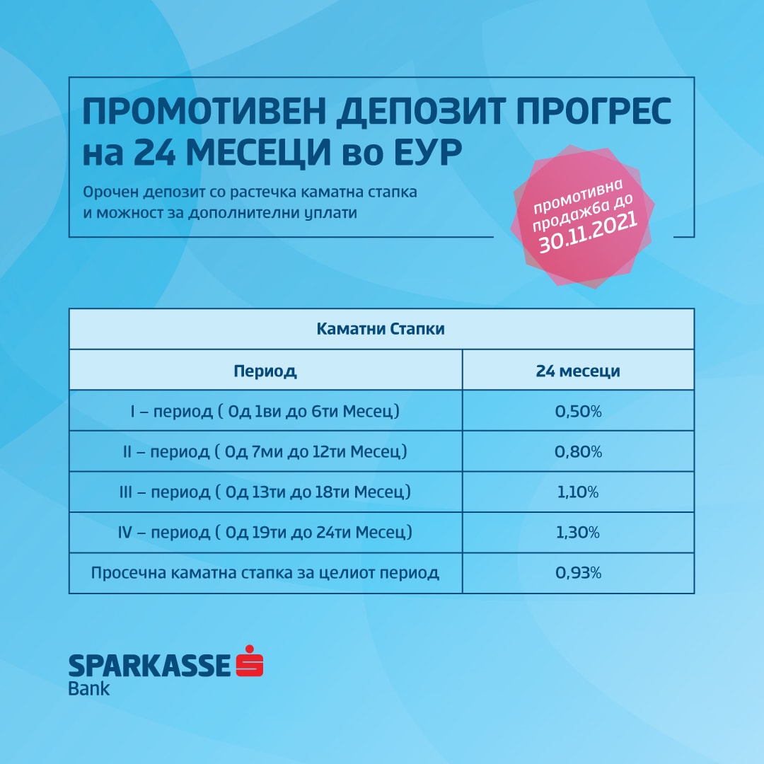Имено, сè до 30 ноември 2021 г., клиентите што ќе ја одберат опцијата Депозит прогрес, добиваат одлични поволни услови за штедење во евра со растечки каматни стапки и можност за дополнителни вложувања.