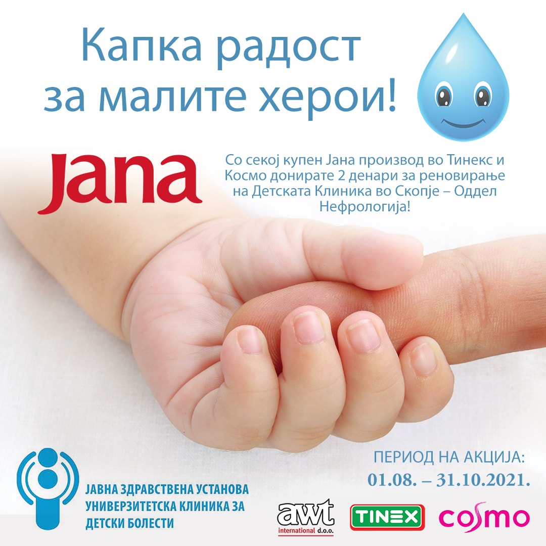 Брендот Јана секогаш се труди да им помогне на оние на кои им е најпотребно. Бидејќи минатата година беше исклучително тешка за сите, особено за најранливите групи, Јана и АВТ, во соработка со Тинекс и Космо, решија да и помогнат на Детската Клиника во Скопје и ги повикуваат граѓаните да помогнат заедно да создадеме разлика, односно подобра иднина за најмилите со свој придонес и мал знак на внимание. Со оваа заедничка акција ќе го реновираме Одделот за Нефрологија при Детската Клиника, со што ќе овозможиме подобри услови на здравствена заштита на нашите најмили.