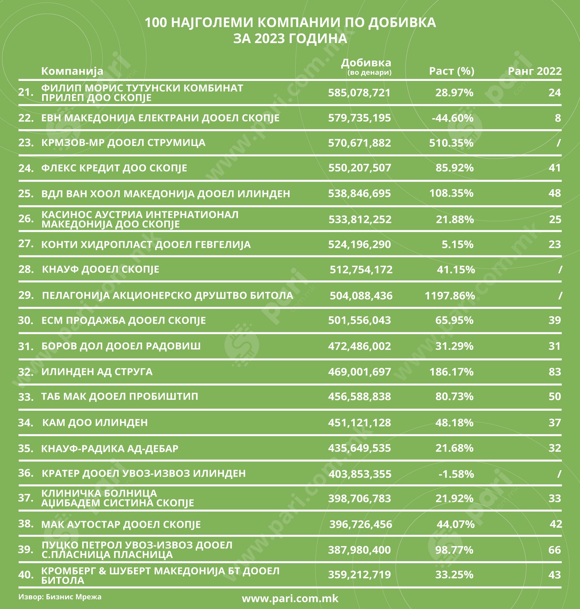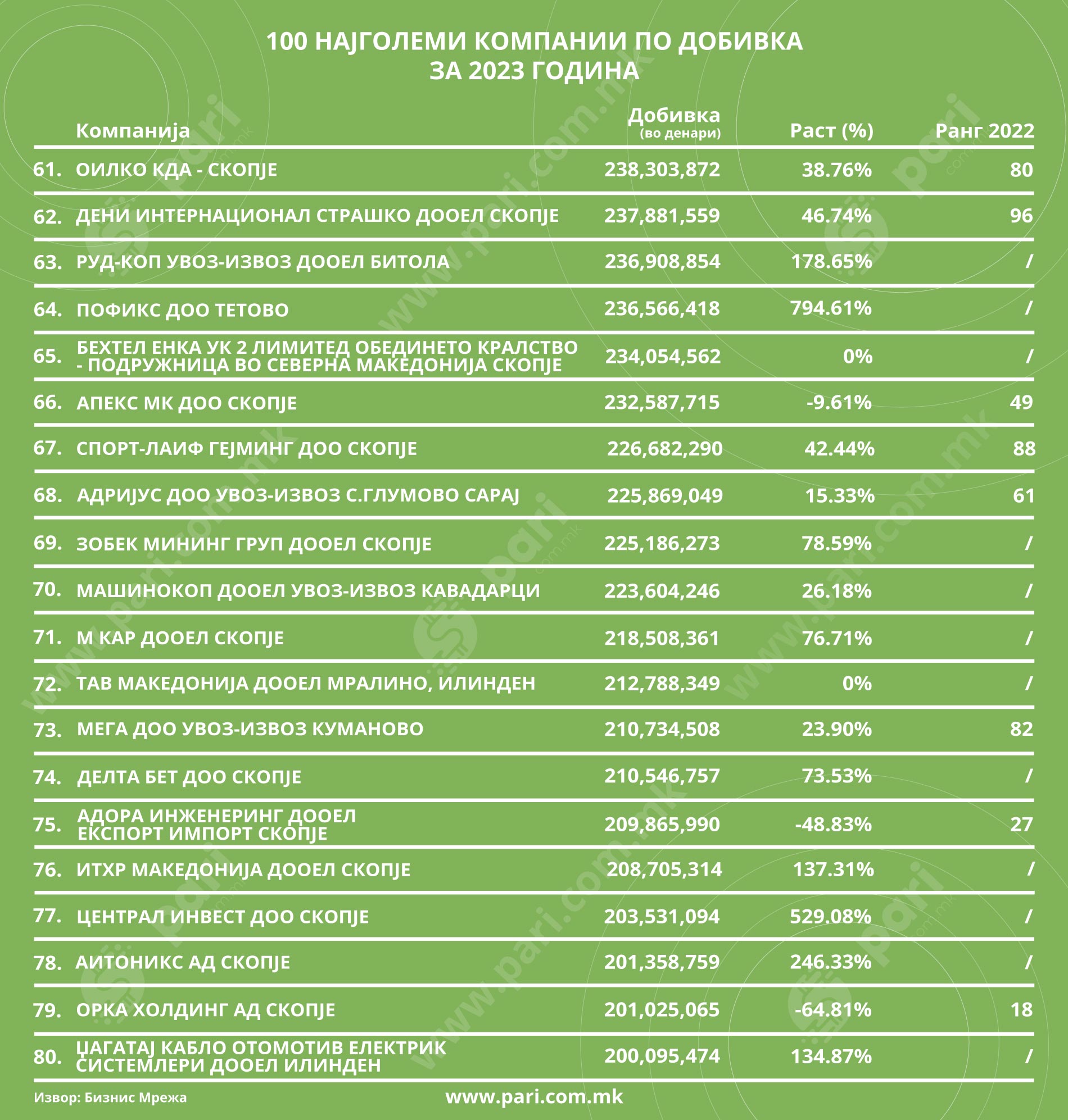 Ви напоменуваме дека предмет на рангирањето на 100 најголеми се компаниите што се трговски друштва во приватна сопственост. Ранг-листата не вклучува правни лица, банки, осигурителни компании, државни институции, компании во државна сопственост и останати правни лица кои не се регистрирани согласно со Законот за трговски друштва. Во прилог листа на 100 НАЈГОЛЕМИ КОМПАНИИ ПО ДОБИВКА за 2023 година