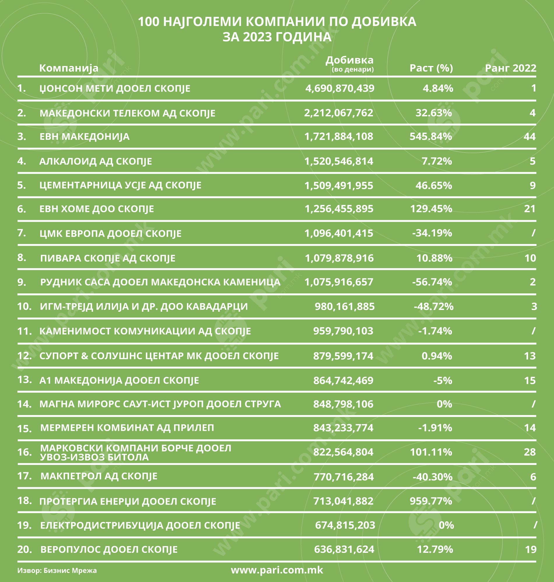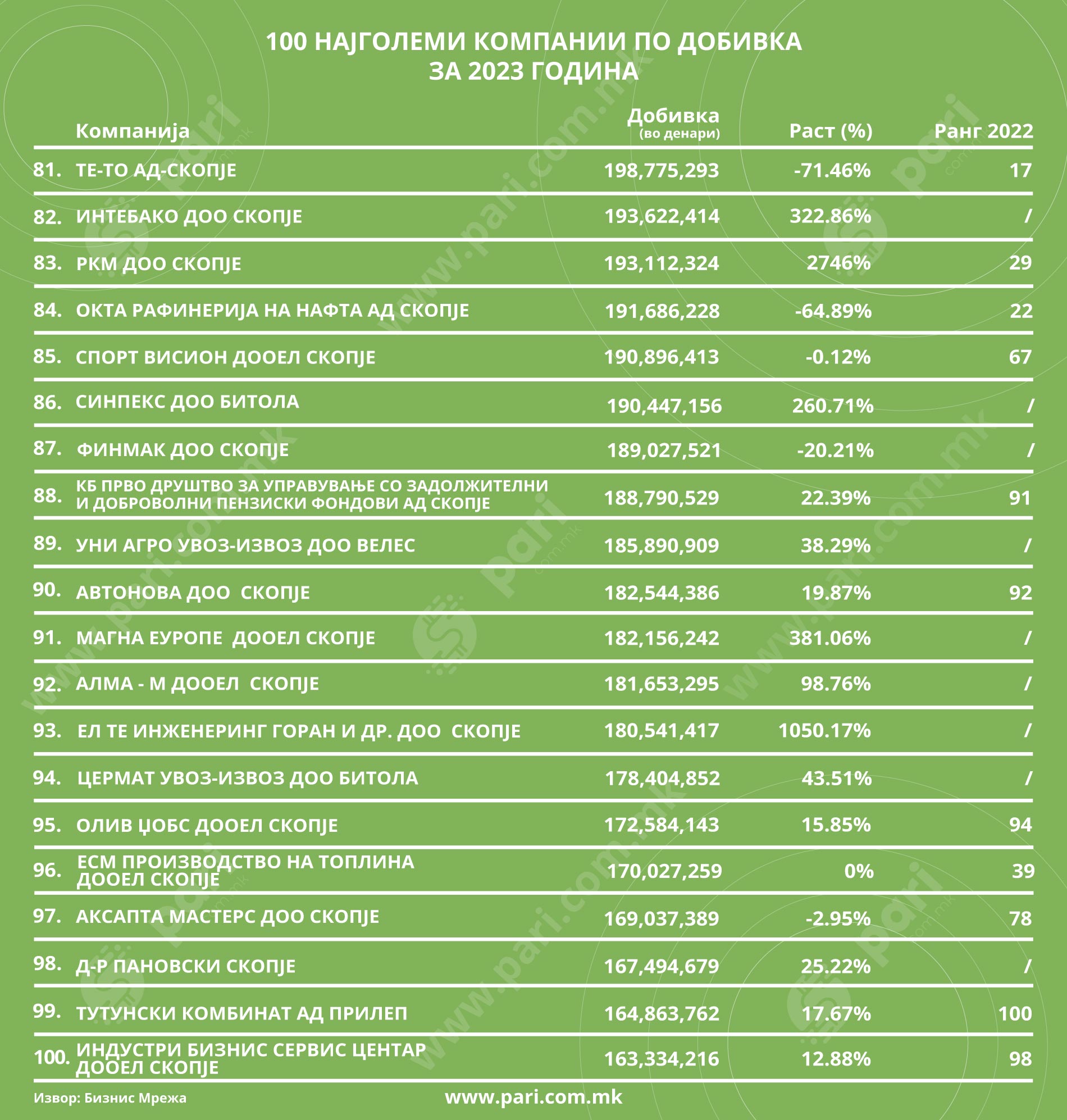 Порталот Пари, во соработка со платформата за бонитетни информации, БизнисМрежа.мк, петта година по ред ви ја претставува листата 100 Најголеми. Проектот 100 Најголеми содржи три категории – најголеми компании по приходи, по добивка и по број на вработени.