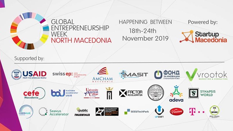 Глобалната недела на претприемништво Северна Македонија ќе се одржи од 18 до 24 ноември во Скопје, Велес, Битола, Дебар и Тетово, по ангажманот на 17 партнери меѓу кои: USAID и Swiss EP во партнерство со Startup Macedoniа, American Chambers Macedonia, MASIT, CEFE Macedonia, Бизнис Акцелератор УКИМ, University American College Skopje, Alumni Association of Ivanov School of Young Leaders, X Factor Акцелератор од Велес, Synapsis World, CEED Hub Скопје, Seavus Accelerator, „Лице в лице“, Youth Educational Forum, SEE Tech Park Tetovo, Vrootok и Upsihift како функционални партнери и Македонски Телеком АД Скопје и Винчини, како поддржувачи на неделата и MK Startups Space.