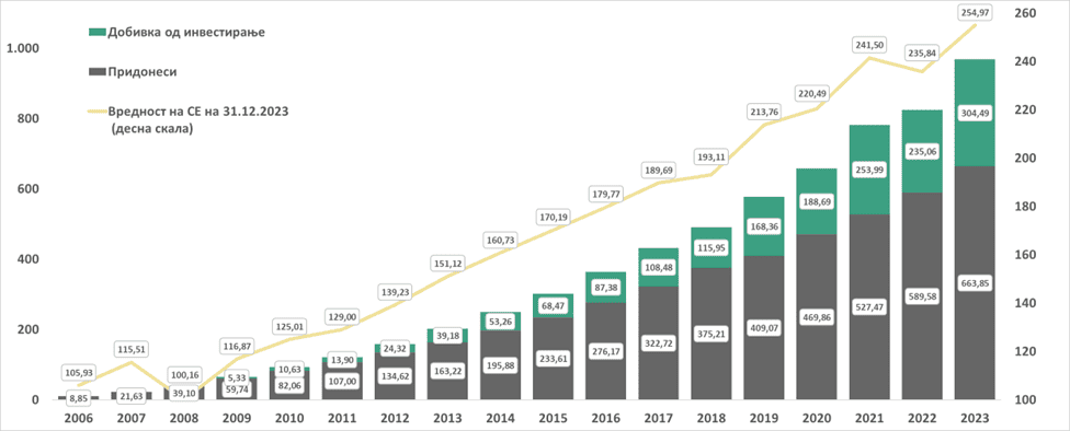 Вредностите на нето придонесите и остварените добивки од инвестирање во апсолутен износ се прикажани во милиони евра (ЕУРМКД=61,5).