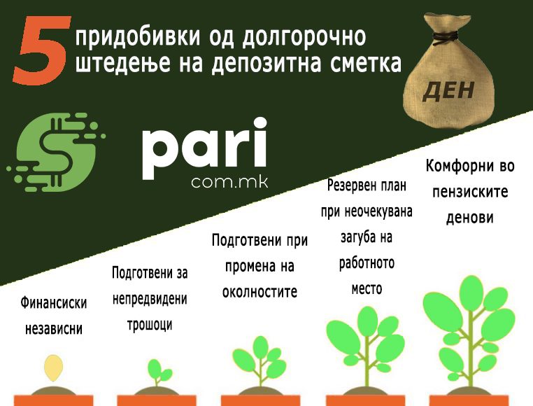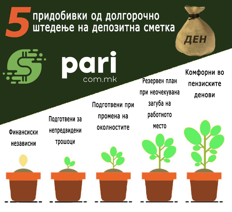Подолу на илустрацијата ви даваме 5 придобивки од долгорочно штедење на депозитна сметка. Доколку започнете со долгорочно штедење, како ќе поминува времето, вие ќе бидете сé посигурни во вашата финансиска иднина: