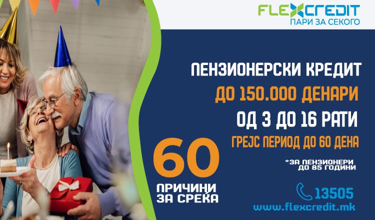Пензионерски кредит со исклучителни услови и 60-дневен грејс-период промовираше финансиското друштво „Флекс кредит“. Станува збор за производот „60 причини за среќа“, наменет исклучиво за пензионерите кои покрај погодноста во однос на грејс- периодот од 60 дена, добиваат и фиксирана отплата на ратите на денот кога се зема пензијата. Овој пензионерски кредит е поуникатен од другите кредити во понудата на домашниот пазар затоа што можат да го добијат пензионери и до 85-годишна возраст.