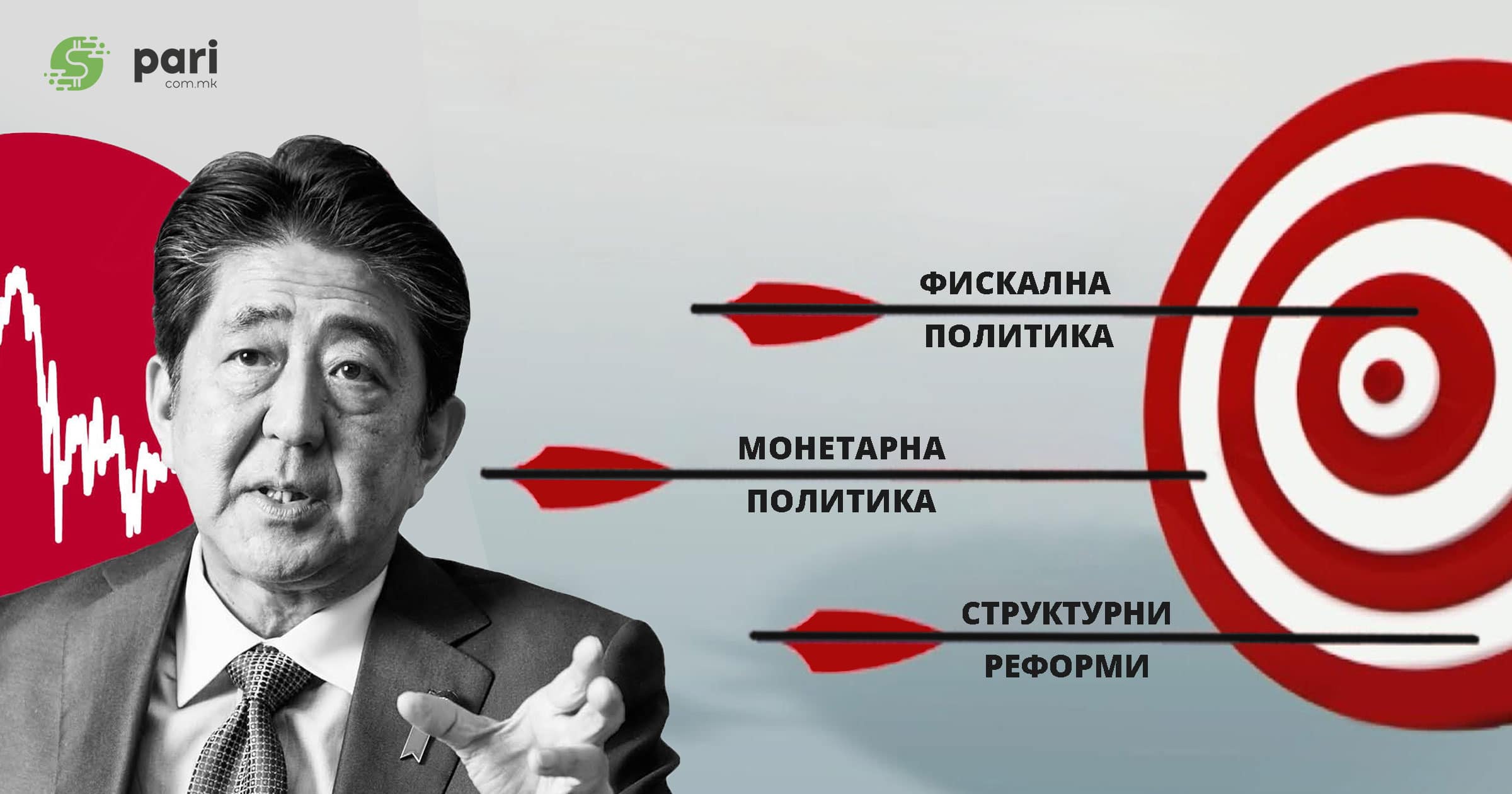 Шинзо Абе својата инспирација за креирање на нов економски модел ја пронајде во една прикaзна за поранешен император. Имено, императорот бил лидер кој верувал дека војната е единствениот начин за зачувување на унитарноста, а пред него се наѕирала нова битка. Тогаш тој го повикал својот син, му дал една стрела и го прашал дали може да ја скрши. Синот без размислување ја земал стрелата и ја скршил на два дела. Потоа, императорот земал три стрели врзани заедно и повторно му ги дал на синот за да ги скрши. Синот, и покрај големите напори, не успеал да ги скриши, а поуката што сакал да ја даде императорот била дека доколку си сама стрела брзо ќе те скршат, но доколку сте повеќе стрели и делувате заедно, многу тешко ќе може да ве победат. Во духот на оваа поука, Абе направи комбинација од три стрели со кои сакаше да ја препороди Јапонија. Трите стрели на Абе се: