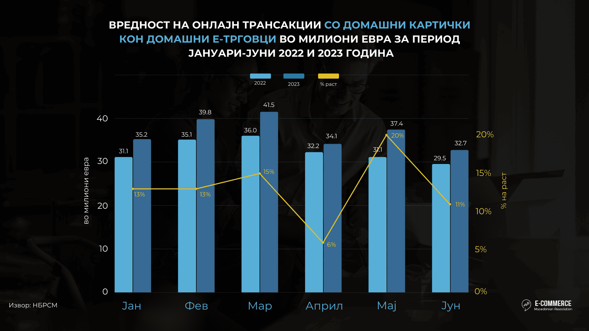 AETM го анализираше трендот на пораст како на вредноста, така и на бројот на онлајн трансакциите, кој продолжува и во првата половина на 2023 година. Согласно најновите податоци за безготовински платежни трансакции на виртуелните места на продажба за период од 6 месеци заклучно до 30.06.2023 година од страна на Народната Банка на Република Северна Македонија, вкупната вредност на онлајн трансакциите реализирани во земјата од Македонци и странци и во странство од Mакедонци, изнесува над 328 милиони евра, што претставува пораст од 18.5% во однос на истиот период минатата година. Бројот на вкупните онлајн трансакции во истиот период изнесува 9.3 милиони и е за 14.6% повеќе од бројот на вкупно направените трансакции на виртуелните места на продажба, што значи просечната нарачка по трансакција се зголемува на 35.4 евра. При тоа просечната трансакција на правните лица е повисока (48.9 евра) во однос на физичките лица (31.5 евра).