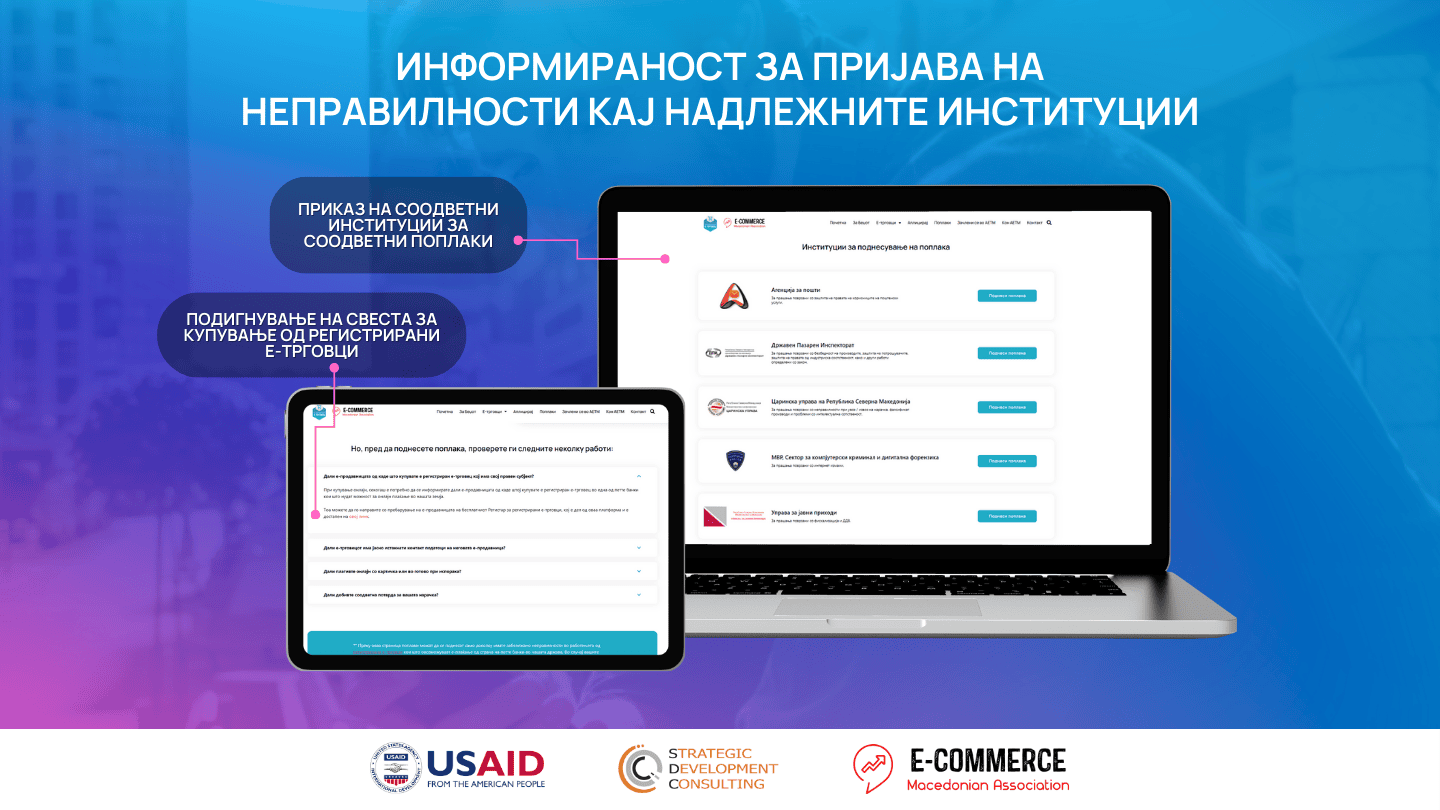 - Информативна содржина за поднесување на поплаки до надлежните институции во случај на непријатни искуства со е-трговијата, како и едукативна содржина за намалување и одбегнување на сивата економија;