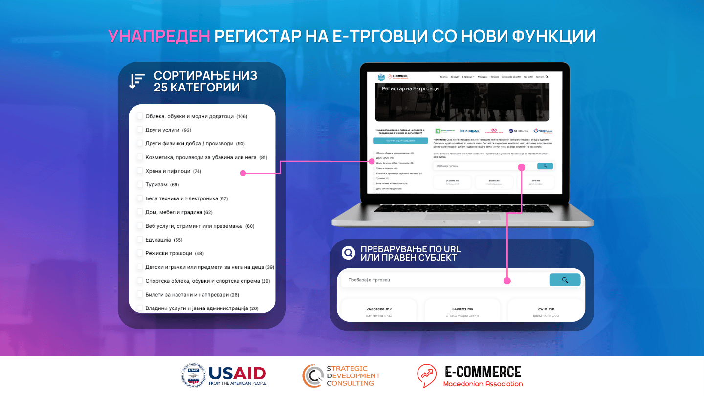 - Единствениот унапреден и категоризиран регистар на онлајн продавачи во С.Македонија кои активно нудат производи или услуги и овозможуваат онлајн плаќање преку една од петте банки во нашата земја кои нудат е-трговија;
