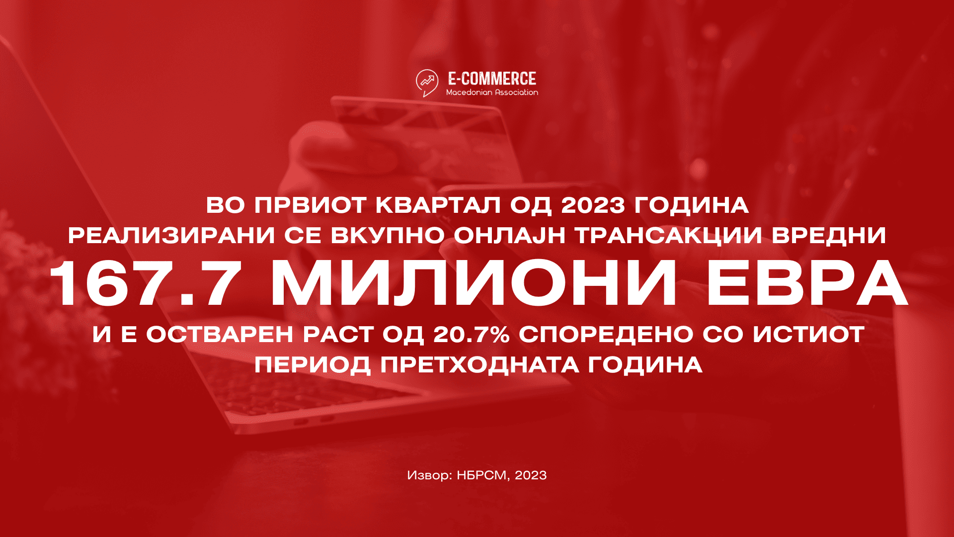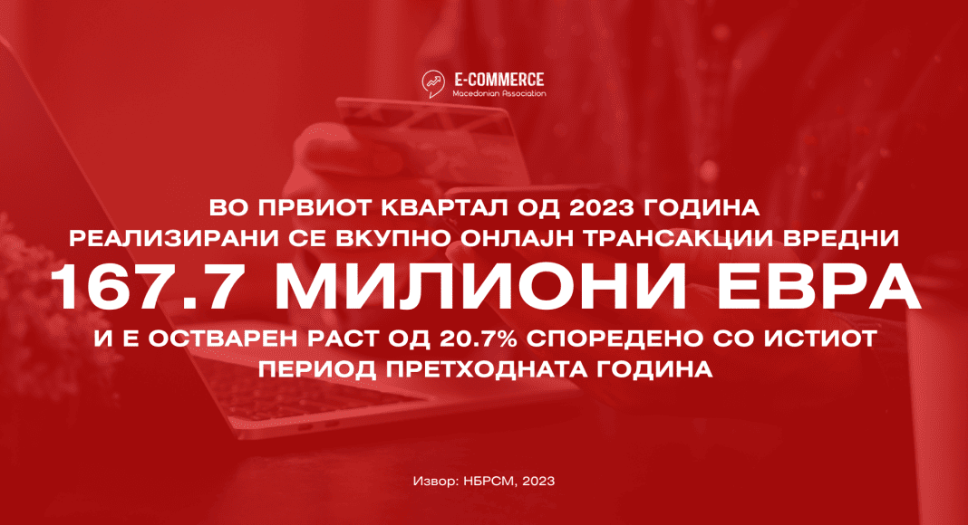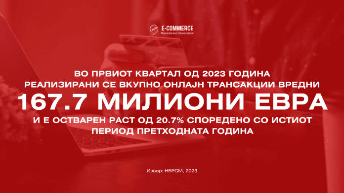 Вредноста на вкупните трансакции направени кон интернет продавниците од Македонци дома и во странство, како и од иматели на странски картички во Р.С.Македонија во првите три месеци од 2023 година изнесува изнесува 10,3 милијарди денари или 167.7 милиони евра и има пораст од 20.7% во однос на истиот период 2022 година. Притоа вредноста на направените вкупни е-трансакции од правните лица растат со побавно темпо, односно има пораст од 20.2% во однос вредноста на направените е-трансакции од физичките лица чиј раст е 20.9% во однос на истиот период минатата година.
