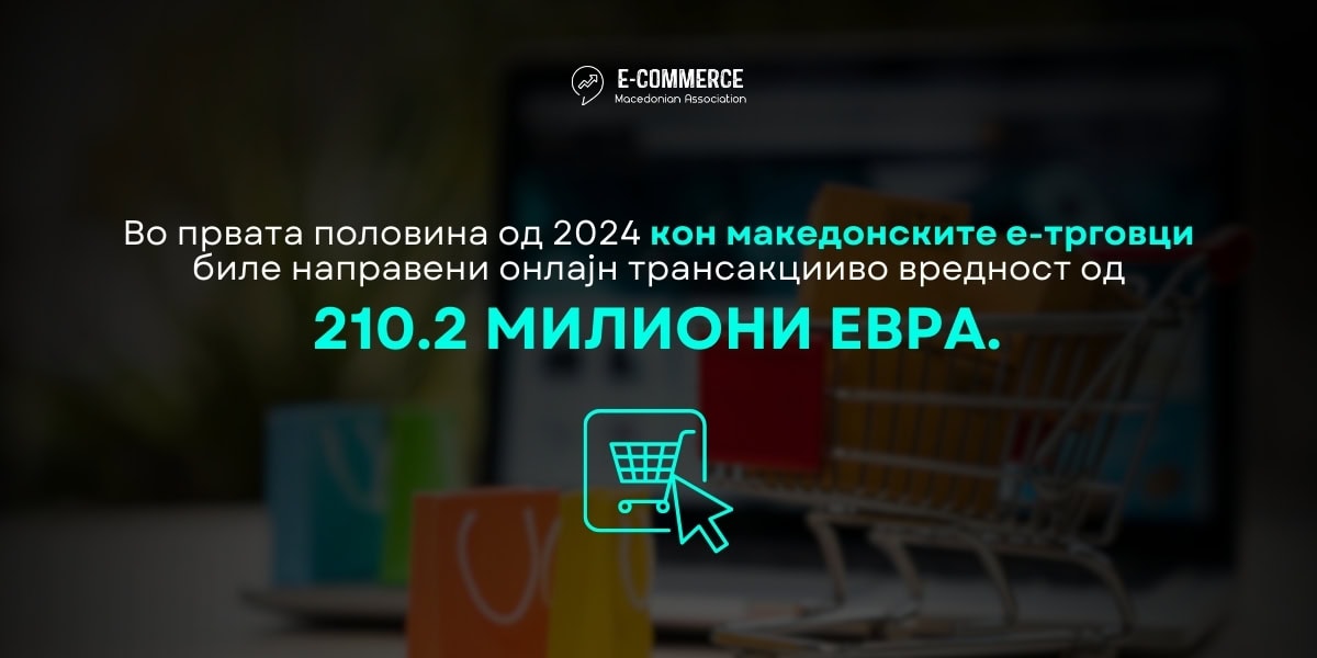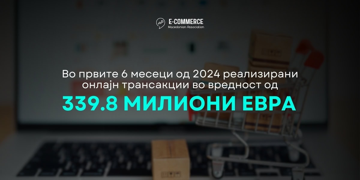Согласно најновите објавени податоци[1] за трансакции на места на продажба за е-трговија (со исклучок на трансакциите со електронски пари) на Народната банка на Република Северна Македонија во првата половина од 2024 година вредноста на вкупните трансакции направени кон интернет продавниците од Македонци дома и во странство, како и од иматели на странски картички изнесува 20,899.8 милиони денари или 339.8 милиони евра. При тоа кон македонските е-трговци биле направени онлајн трансакции во вредност од 210.2 милиони евра од домашни и странски иматели на платежни картички. Тоа преставува учество од 61.8% во вредноста на направените вкупни онлајн трансакции. При тоа од македонски иматели на платежни картичи кон домашните е-трговци направена е вредност од 11,875.6 милиони денари или 193.1 милиони евра, што преставува учество од 56.8%, од странци направена е вредност од 1049.7 милиои денари или 17.1 милиони евра односно учество од 5%. Од друга страна Македонците во странство напавиле онлајн трансакции во вредност од 7974.5 милиони денари или 129.7 милиони евра односно 38.2% од вредноста на вкупните трансакции.