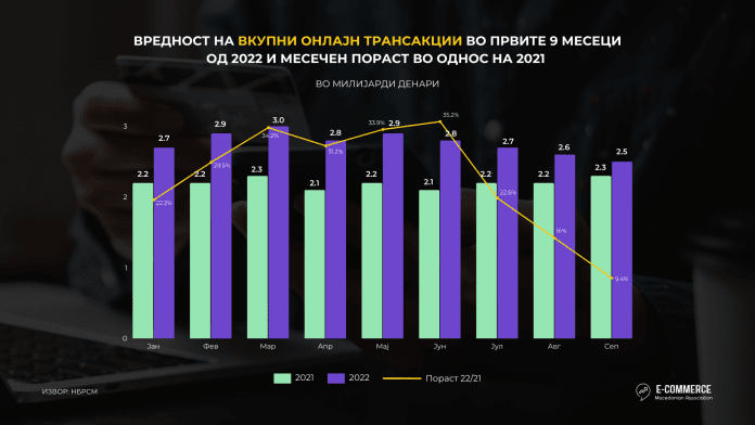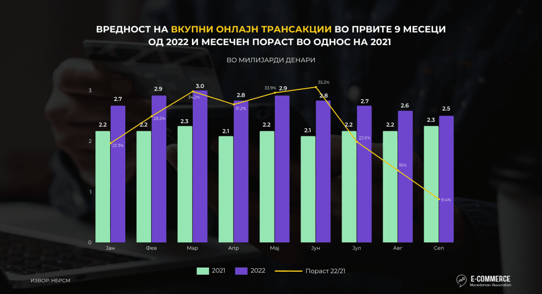 Согласно најновите објавени податоци за безготовински платежни трансакции на виртуелните места на продажба на Народната банка на Република Северна Македонија во првите девет месеци од 2022 година вкупната вредност на онлајн трансакциите реализирани во земјата и во странство со домашни и странски картички, изнесува 25.3 милијарди денари (2.8 милијарди денари просечно месечно) што претставува пораст од 28.2% во однос на истиот период минатата година кога се остварила вредност од 19.7 милијарди денари (2.2 милијарди денари просечно месечно). Гледано по месеци, во третиот квартал почнувајќи од јули кога има пораст од 22.6% речиси ист како порастот во јануари, во наредните месеци се намалува и во септември порастот на вкупните онлајн трансакции изнесува 9.4% во однос на истиот месец минатата година.