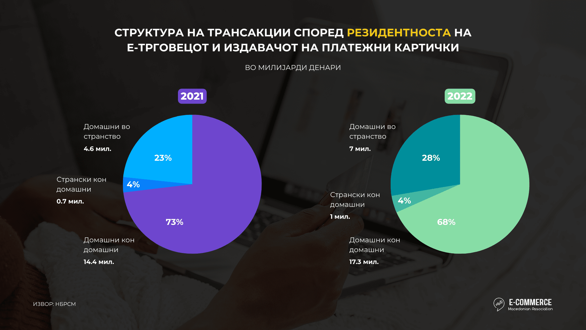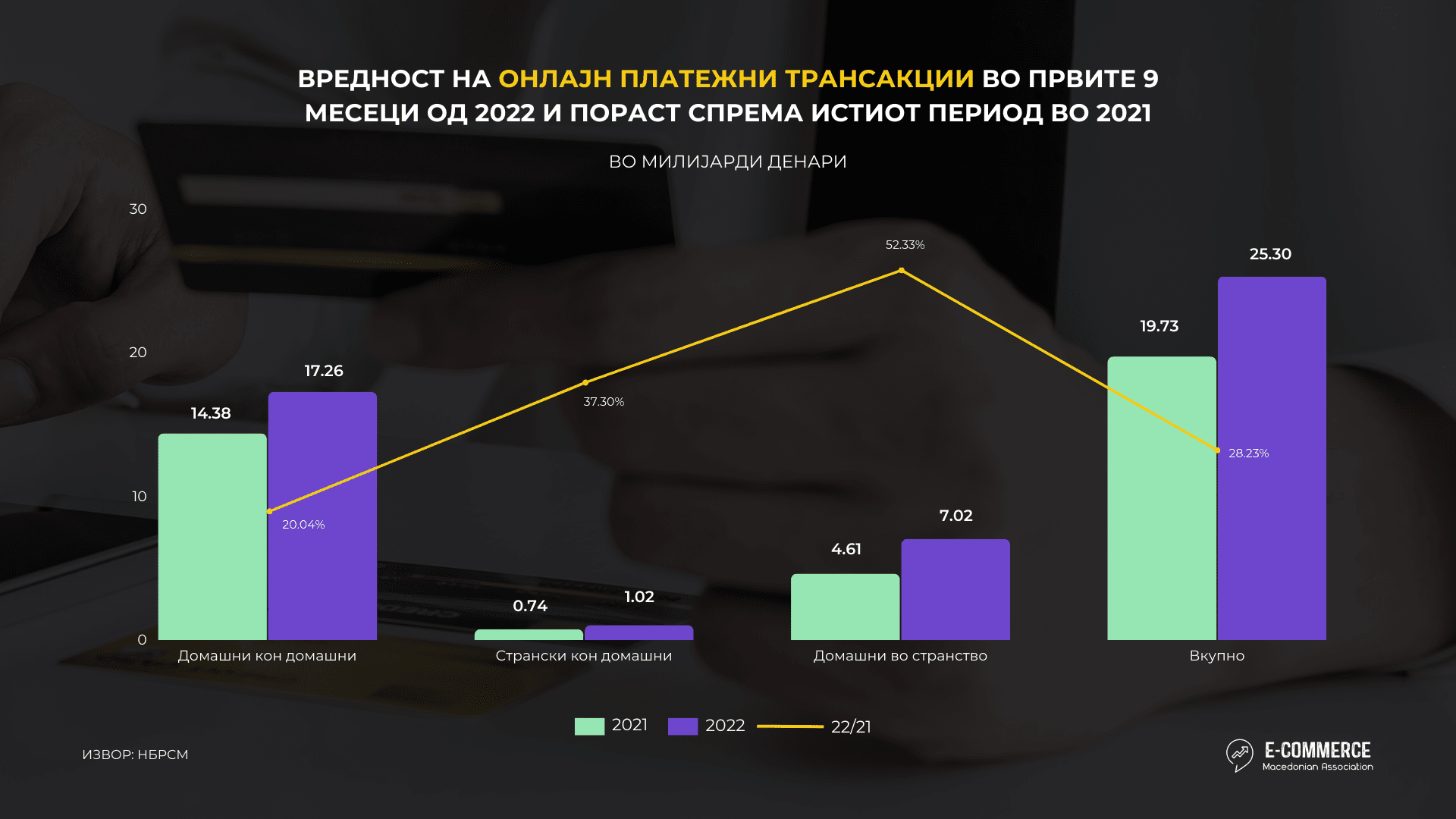 Со домашни картички кон домашни е-трговци во првите 9 месеци од 2022 година остварени се 17.3 милијарди денари и остварен е раст од 20% во споредба со истиот период минатата година. Она што е забележително како резултат на враќање на животот во нормала е поголем раст на вредноста на направените трансакции кон странски е-трговци, како и од странски картички кон домашните е-трговци. Поголем пораст има кај купувањето во странство со домашни картички и во првите 9 месеци од 2022 година остварени се 7 милијарди денари што преставува раст од 52.3% во споредба со истиот период минатата година. Странците кон домашните трговци направиле онлајн трансакции во износ од милијарда денари односно остварен пораст во првите 9 месеци од 2022 година од 37.3% во однос на истиот период минатата година. Кон македонските е-трговци се слеале 18.3 милијарди денари остварени од домашни и странски картички во разгледуваниот период што значи пораст од скоро 21% во однос на истиот период минатата година.