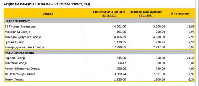 Во јануарскиот билтен од 2021 година, кој го објави Македонска берза може да ги споредиме акциите кои се со најголем пораст, и пад на вредноста.
