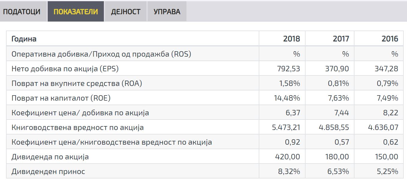 Во 2018 година, дивидендата по акција изнесувала 420 денари. Додека во 2017 година, дивидендата по акција изнесувала 180 денари, а во 2016 година дивидендата изнесувала 150 денари по акција.