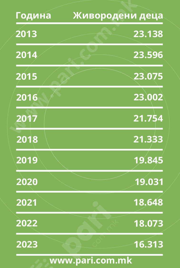 Порталот „Пари“ ги собра податоците од сите квартали во 2023 година и дојдовме до податок за негативен прираст од 3.425 лица во 2023 година, затоа што лани имало 16.313 живородени деца, а во истиот период бројот на умрени бил 19.738 луѓе.