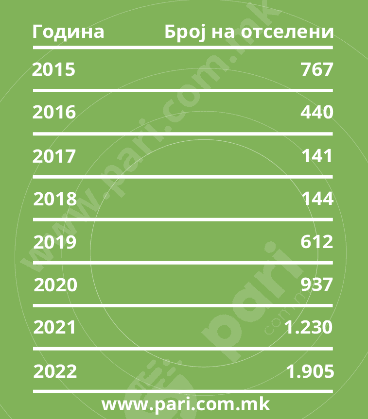 Во документот за проекциите на населението до 2070 година, Државниот завод за статистика наведува дека ние немаме некоја прецизна евиденција за отселувањето на населението. Сепак, ДЗС дава одреден приказ за отселени граѓани во други држави, а и од него може да се види трендот на раст на отселувањето. Во периодот од 2015 до 2022 година, бројот на годишните отселувања станал повеќе од двојно поголем. Имено, во 2015 година се отселиле 767 граѓани, а во 2022 година се отселиле 1.905. Во тие 8 години, вкупниот број на отселени бил 6.176. Така барем велат податоците со кои располагаат статистичарите, иако е јасно дека таа бројка е поголема.