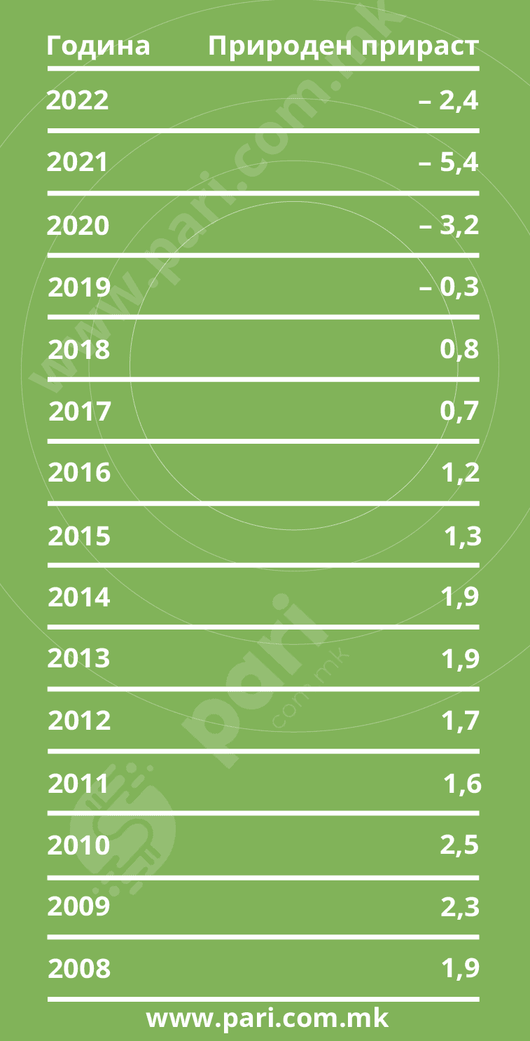 Годишните негативни стапки почнуваат од 2019 година, кога природниот прираст е минус 0,3 на 1.000 жители. Секако, најекстремното е во 2021 година, кога стапката на природен прираст е минус 5,4 на 1.000 жители. Но, ако погледнеме наназад, во 2010 година природниот прираст бил 2,5 на 1.000 жители.