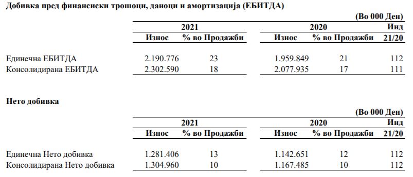 Остварената единечна нето-добивка во 2021 година изнесува 1.281.406 илјади денари и во споредба со остварената во 2020 година бележи зголемување за 12%