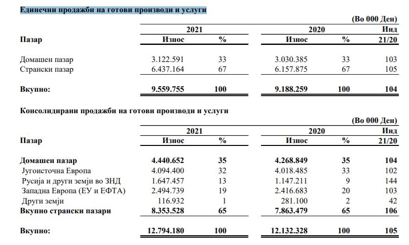 Остварените консолидирани вкупни приходи во периодот јануари-декември 2021 година изнесуваат 13.196.695 илјади денари и во споредба со остварените во истиот период во 2020 година бележат пораст од 5%. Во структурата на вкупните приходи, најголемо учество, 97%, имаат приходите остварени со продажба на производи и на услуги, кои во споредба со остварените во 2020 година бележат пораст од 5%