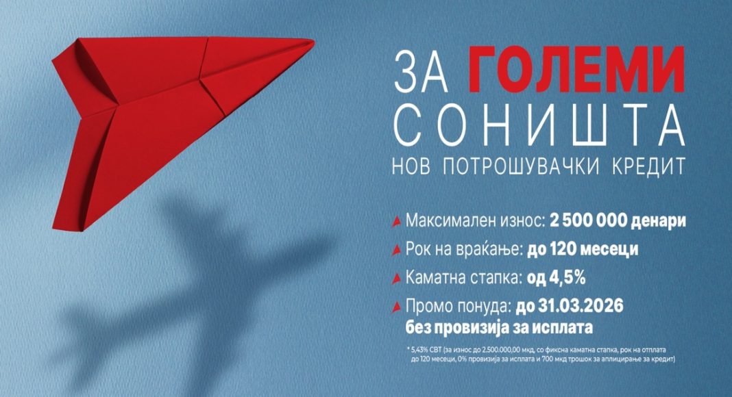 Дополнително, Банката обезбедува промотивна понуда до 31.03.2026 година, во рамки на која клиентите ќе можат да го искористат кредитот без провизија за исплата, што претставува значајна финансиска предност и дополнително олеснување за клиентите.