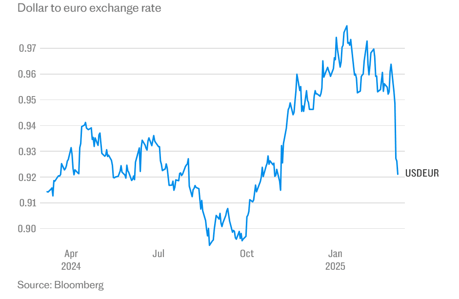 Додека Трамп ги раскинува трговските договори – дури и оние што самиот ги потпишал, како со неговите закани кон Канада и Мексико – и ги користи тарифите како алатка за заплашување против оние за кои смета дека му згрешиле нему или на неговата нација, или само за да искористи моментална предност во разговорите за неповрзани теми, така доларот станува помалку привлечен.