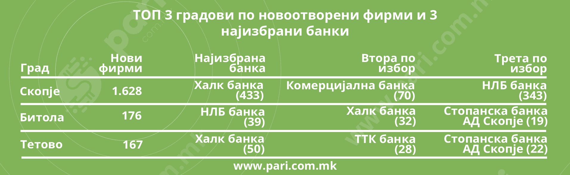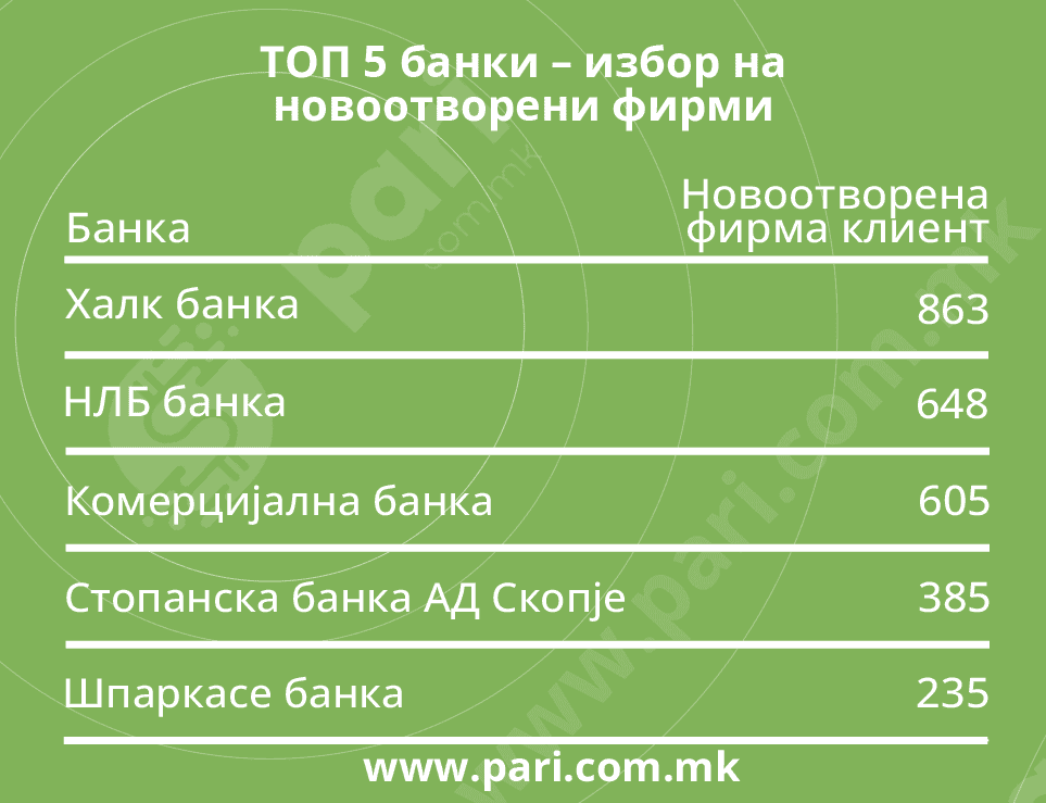 Анализата на податоците покажува дека најмногу новоотворените компании овие 5 банки ги избрале како матична банка: Халк Банка (863), НЛБ (648), Комерцијална Банка (605), Стопанска Банка-Скопје (385), Шпаркасе Банка (235).