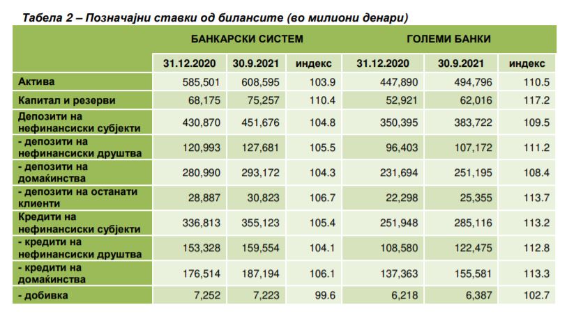 Во третиот квартал од 2021 година банкарскиот сектор остана стабилен и забележа забрзан раст на активностите. На страната на изворите на средства, депозитите бележат континуиран раст, што беше поддржано и од исплатените средства од страна на државата, заради подобрување на ликвидноста на компаниите во услови на здравствена криза. Кредитната активност на банките исто така забележа забрзан раст, којшто во поголем дел беше резултат на зголеменото кредитирање на домаќинствата, при солиден позитивен придонес и на кредитите на претпријатијата.