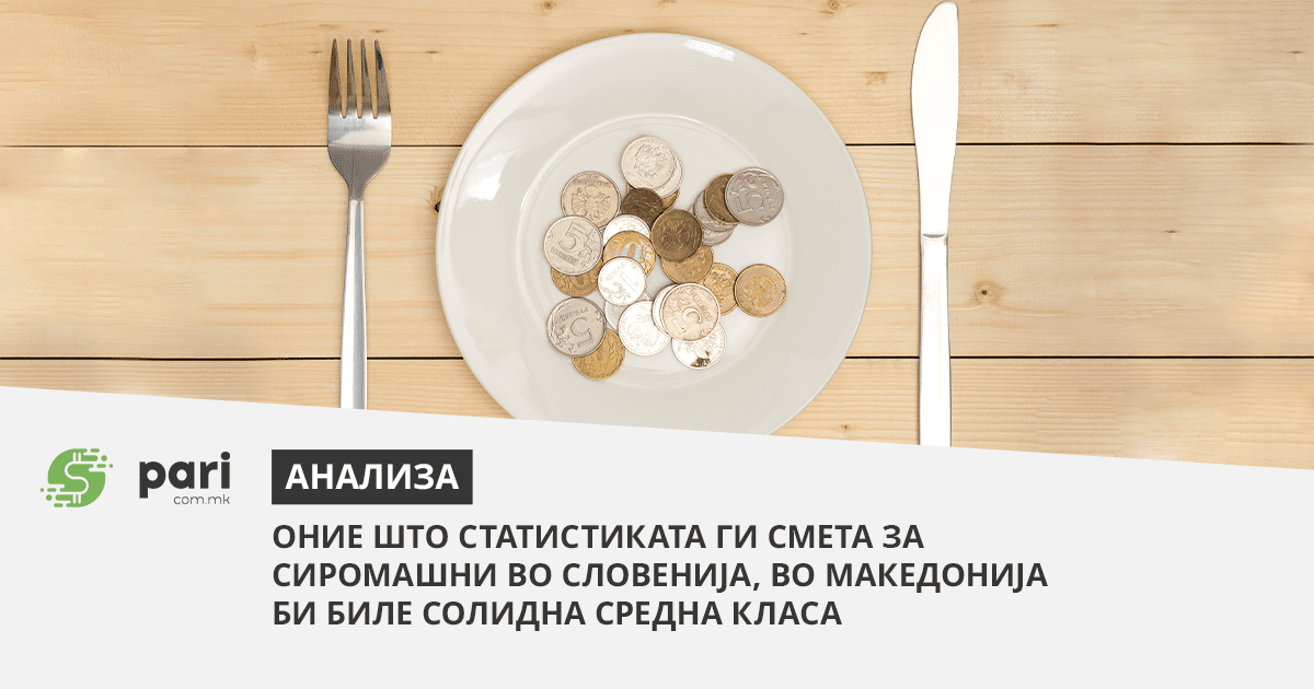 Во Македонија, Србија и Црна Гора, стапката на сиромаштија во однос на вкупното население се движи околу 21%, додека пониски стапки, очекувано, имаат Словенија и Хрватска. Во однос на стапката на сиромаштија кај невработените, таа е највисока во Македонија, но кај нас, пак има најниска стапка на сиромаштија кај пензионерите. Но, причините за ова се во приходите со кои располагаат жителите во една земја, па износот што статистичарите го пресметуваат како праг на сиромаштија е различен од земја во земја, а во Македонија е убедливо најнизок. Така, со парите на сиромашниот Словенец, Македонецот би бил солидна средна класа. Имено, во Словенија долниот праг на сиромаштија за едночлено семејство е 8.864 евра на годишно ниво (738 евра месечно) , за разлика кај нас, каде што е 1.800 евра годишно (150 евра месечно).