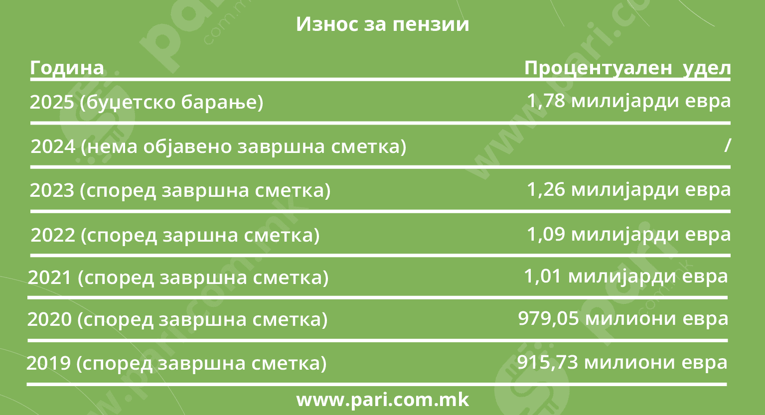 Низ годините се зголемувал и износот за пензиите, па така, според завршните сметки на Фондот за ПИОСМ, вкупниот исплатен износ за пензии пред пандемијата бил 915,8 милииони евра, а во Буџеткото барање за 2025 година е наведено дека за пензии се предвидени речиси 1,8 милијарди евра, што значи дека вкупниот износ е речиси двојно зголемен во однос на 2019 година. Овде, секако, влегува линерното зголемување по 2.500 денари за оваа и наредната година.