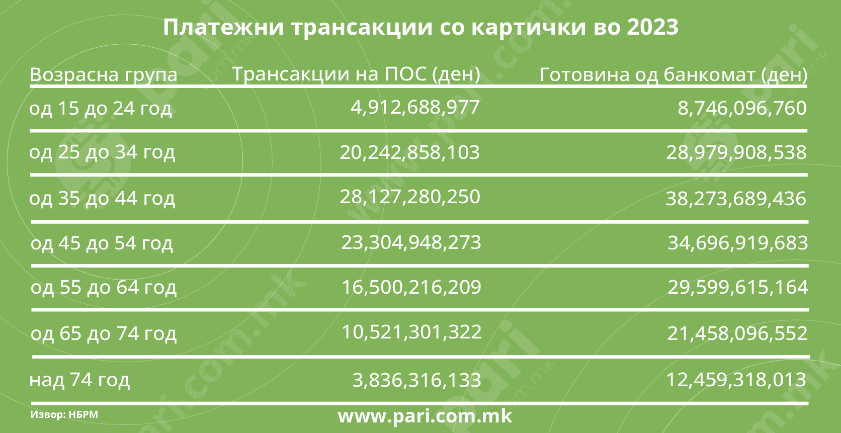 Дури ни помладите генерации, кои располагаат со најголеми лични месечни буџети, не се одвикнати од кешот и повеќе пари повлекуваат на банкомат, а помалку користат преку картичка. Порталот „Пари“ ги анализираше податоците на НБРМ, според кои, минатата година граѓаните на возраст од 35 до 44 години од банкомат повлекле 38,3 милијарди денари, а со картичка во продавница потрошиле 28,1 милијарда денари. Следните се тие на возраст од 45 до 54 години, кои во готовина повлекле 34,7 милијарди денари, а со картичка платиле 23,3 милијарди денари. Во Македонија, на картичките најмалку им веруваат луѓето на возраст од 55 до 64 години, кои во 2023 година од банкомат извадиле скоро 30 милијарди денари, а на картичка потрошиле двојно помалку, односно 16,5 милијарди денари.