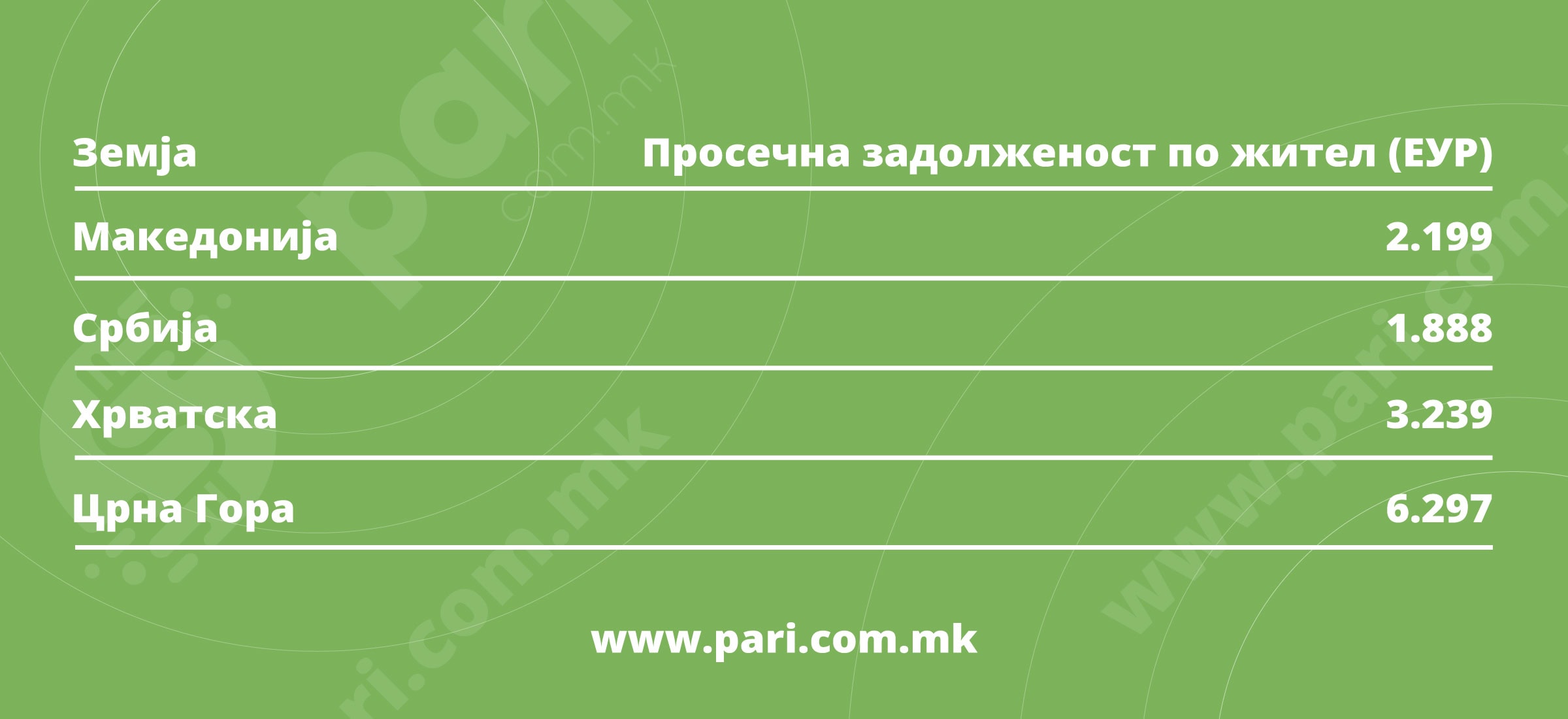 Колкава е задолженоста по жител во овие земји? Во јануари годинава, просечната задолженост по граѓанин во Македонија изнесувала 2.199 евра, а во јануари 2024 година била 2.022 евра. Во Србија, просечната задолженост по жител е 1.888 евра, во Хрватска – 6.297 евра (заклучно со декември 2024 година), а во Црна Гора изнесува 3.239 евра.