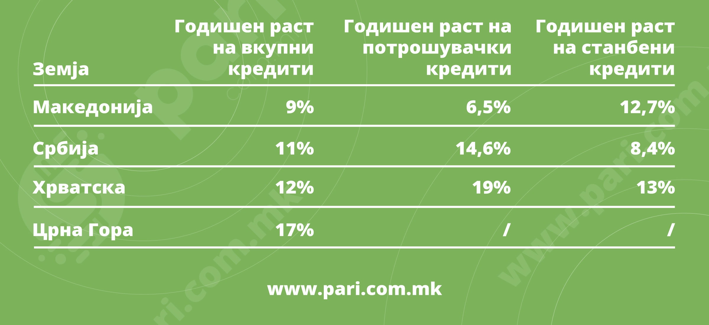 Кога станува збор за изминатата година, трендот кај македонските граѓани е обратен од тој на Хрватите и Србите. Во 2024 година, долгот заснован на потрошувачките кредити, негативните салда и на кредитните картички, Македонците го зголемиле за 6,5%, а по основ на станбени кредити за 12,7%.