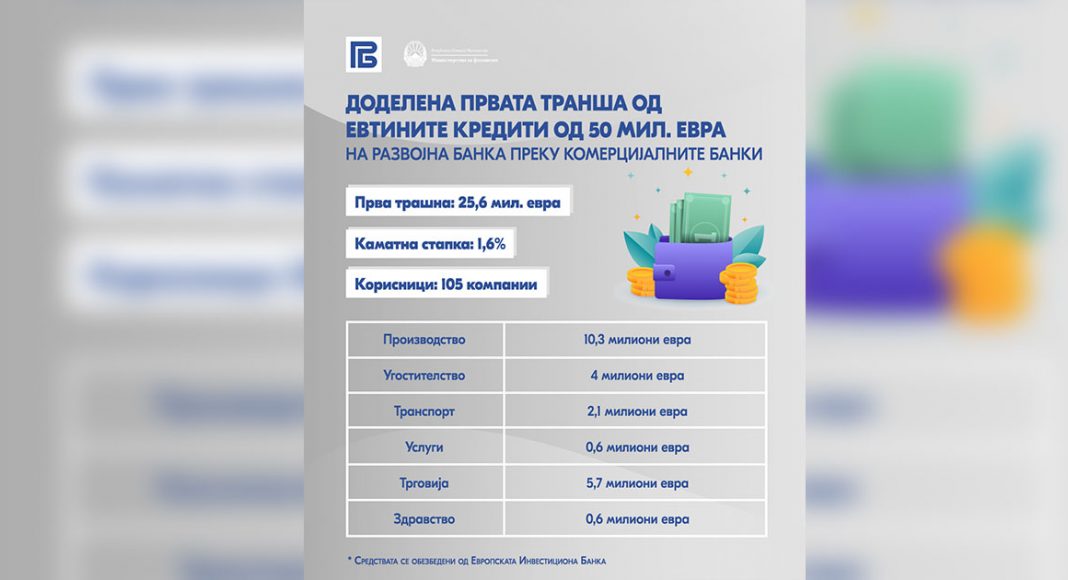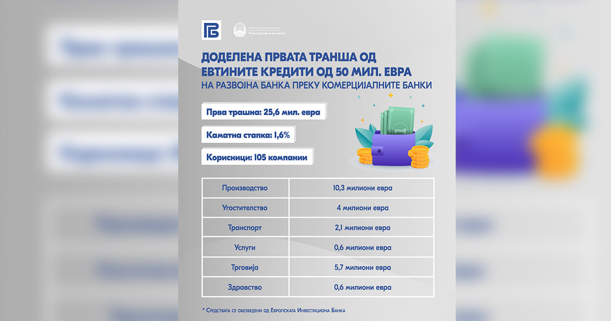 Доделена е првата транша од евтините кредити од 50 милиони евра од Развојна банка на Северна Македонија АД пласирани преку комерцијалните банки. Доделени се 25,6 милиони евра на: