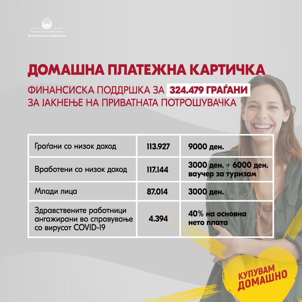 Најдоцна до 18ти јули ќе бидат издадени 325.000 картички со финансиска поддршка – средства кои преку граѓаните ќе се влеат кај погодените сектори за купување на домашни производи и услуги. 🇲🇰.