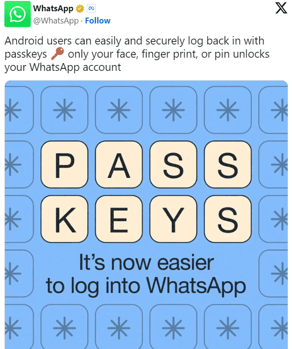 Апликацијата за разговор во сопственост на Мета лансираше поддршка за лозинка за Android, што значи дека корисниците повеќе не мора да користат OTP од двофакторна автентикација за да можат да се логираат на нивната сметка. Лозинките се релативно нова технологија за најавување дизајнирана да биде отпорна на напади на фишинг, протекување лозинки и други безбедносни пропусти што ги мачат нејзините постари врсници.