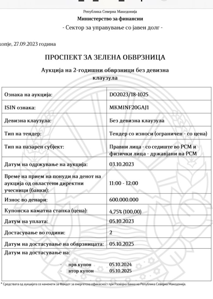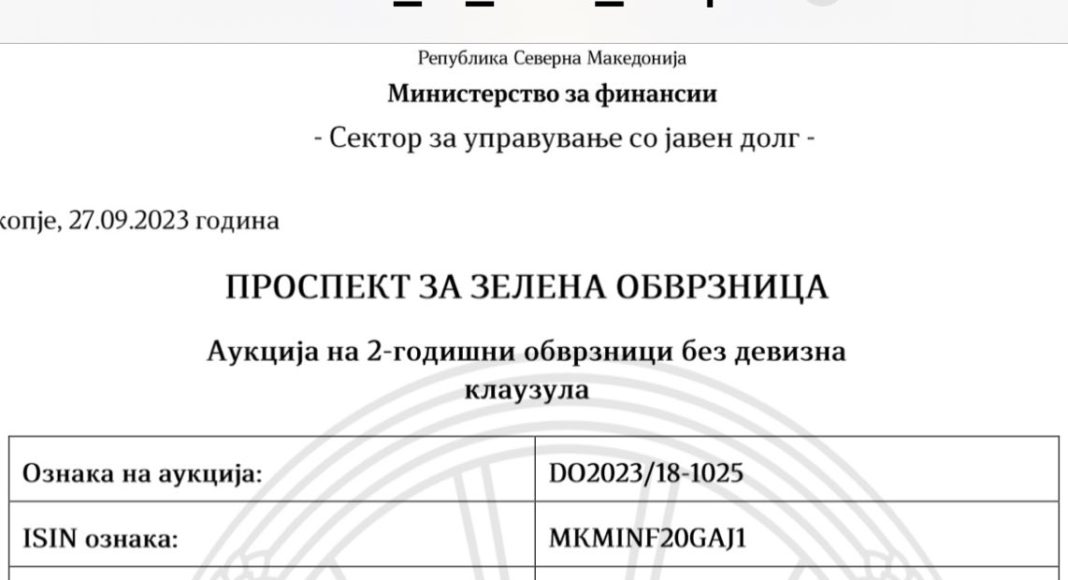 Министерството за финансии го објави Проспектот за зелената обврзница со ознака на аукција DO23/18-1025 и ISN ознака MKMINF20GAJ1.