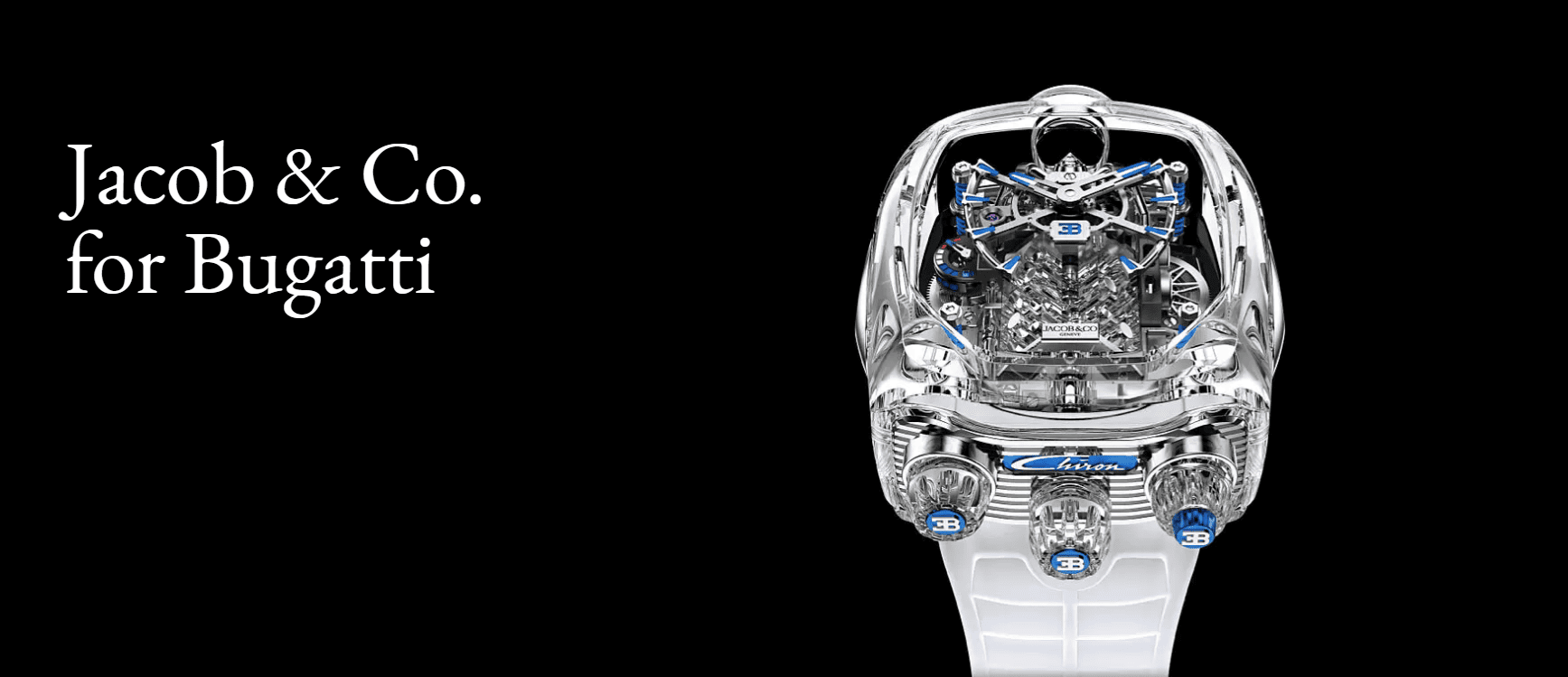 Се започна со идеја замислена од Jacob & Co. заедно со Bugatti – како да се репродуцира висцералната сензација на иконичниотиот мотор со 16 цилиндри на Bugatti во часовник. Партнерството помеѓу францускиот производител на луксузни хипер-спортски автомобили Bugatti и водечкиот изработувач на софистицирани часовници од Њујорк и Женева, Jacob & Co. создаде линија на ексклузивни производи од брендот Bugatti.