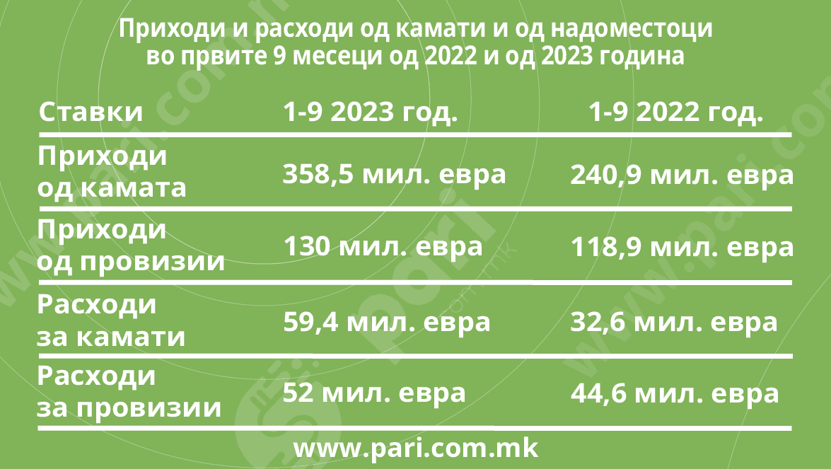 Истовремено, банките наплаќаат разни провизии и надоместоци. За деветте месеци од годинава овој износ е 130 милиони евра. Паралелно со тоа, банките имаат обврски за разни провизии и надоместоци што ним им се наплаќаат, а тој износ е 52 милиони евра.