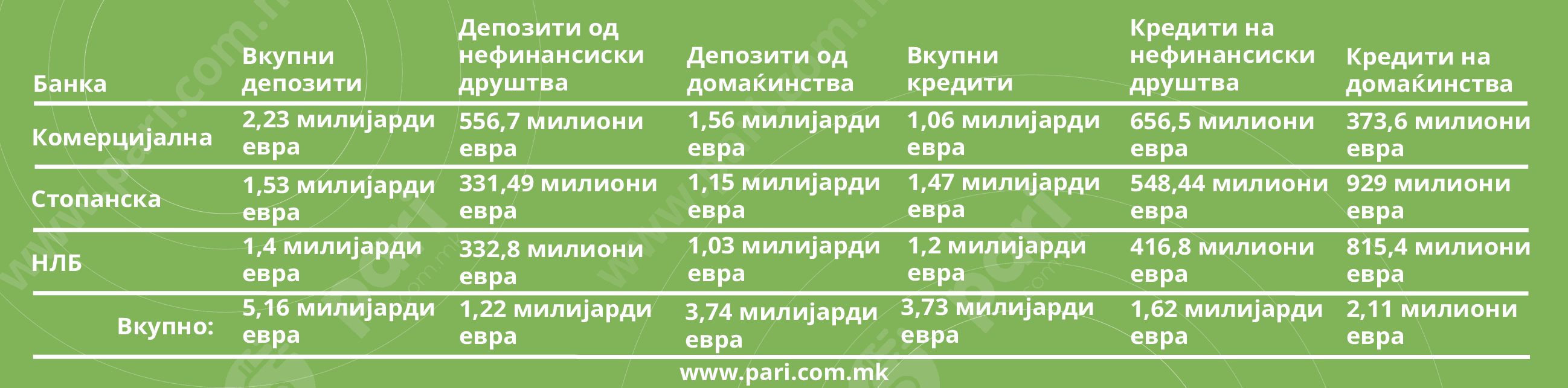 Во поделбата на колачот најголемиот дел го добива тројката Комерцијална, Стопанска и НЛБ банка. Кај нив се доверени 5,16 милијарди евра како влогови од граѓаните и од компаниите. Што им овозможува да бидат и во улогата на најголеми кредитори. Од вкупните позајмени пари, 3,73 милијарди евра се побарани, одобрени и исплатени од овие банки.