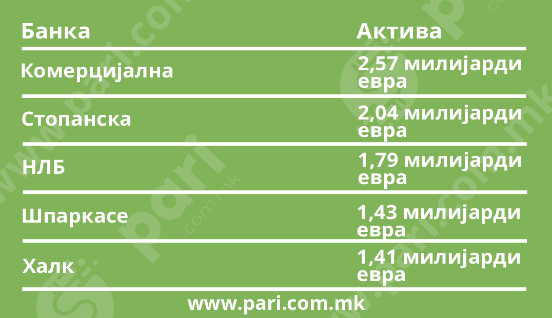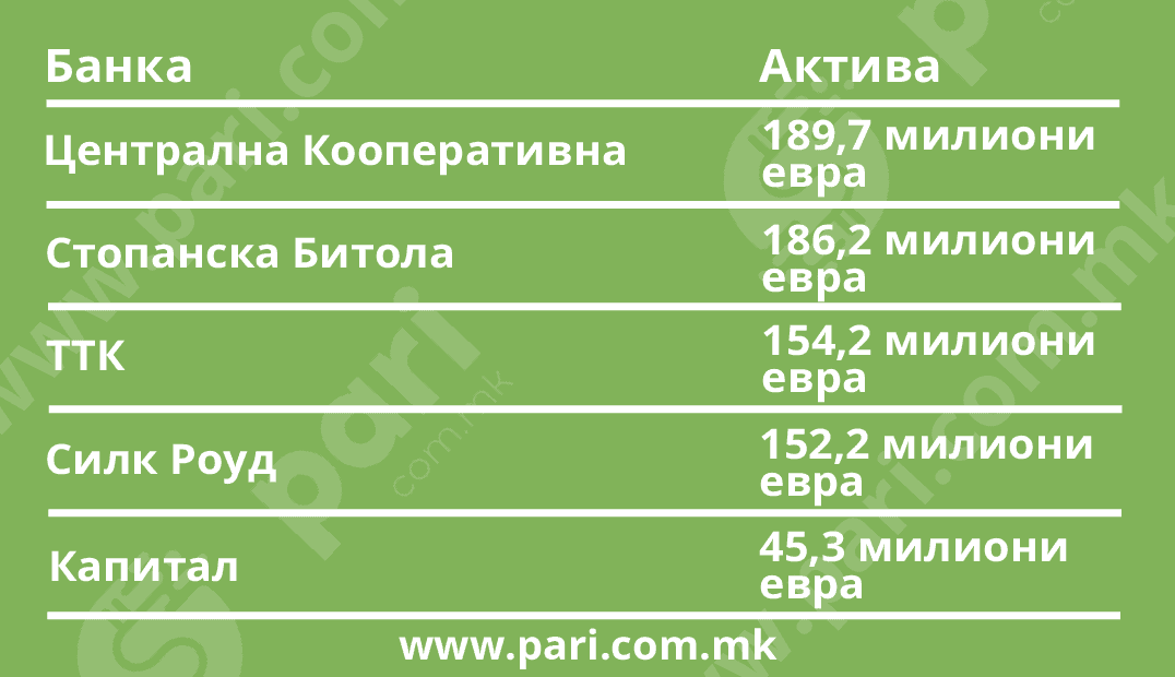 Активата пониска од 192 милиони евра означува мали банки: Централна Кооперативна со 189,7 милиони евра; Стопанска Битола со 186,2 милиони евра; ТТК со 154,2 милиони евра; Силк Роуд со 152,2 милиони евра и Капитал со 45,3 милиони евра.